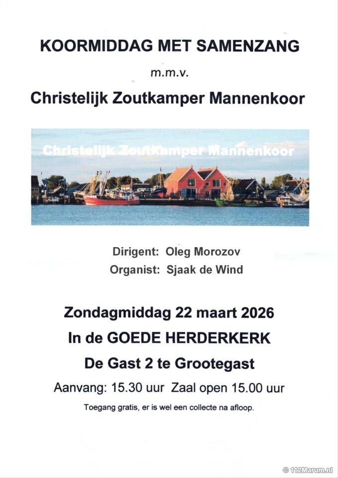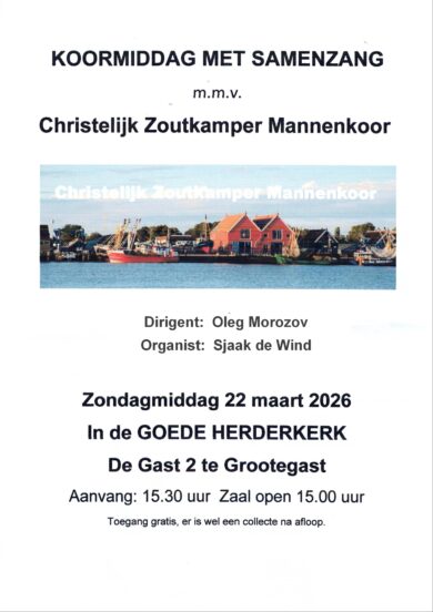 Koormiddag met samenzang in de Goedeherderkerk in Grootegast Datum: zondag 22 maart Op zondag 22 maart a.s. wordt er in de Goede Herderkerk in Grootegast een Koormiddag met Samenzang gehouden. Medewerking wordt verleend door Christelijk Zoutkamper Mannenkoor. De zaal is open om 15.00 uur. Aanvang is om 15.30 uur. Dit item delen: Op Facebook Op X