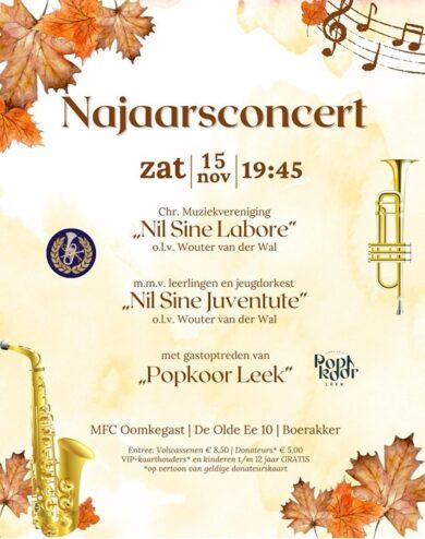 Najaarsconcert met Muziekvereniging Nil Sine Labore Datum: zaterdag 15 november Op 15 November organiseert Muziekvereniging Nil Sine Labore een najaarsconcert met medewerking van Popkoor Leek. Het thema van het concert is filmmuziek. Het concert begint om 19.45uur Adres: Olde Ee 10 Boerakker Voor meer info zie de flyer. Dit item delen: Op Facebook Op X
