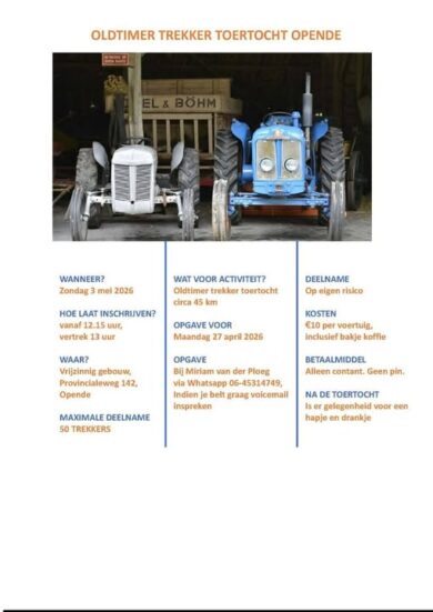 Oldtimer trekkertoertocht Opende Datum: zondag 3 mei Op zondag 3 mei a.s. wordt er een Oldtimer trekkertoertocht verreden in en rond Opende. De toertocht start om 13.00 uur vanaf het Vrijzinnig gebouw aan de Provincialeweg 142 in Opende. Voor meer info zie de flyer. Dit item delen: Op Facebook Op X