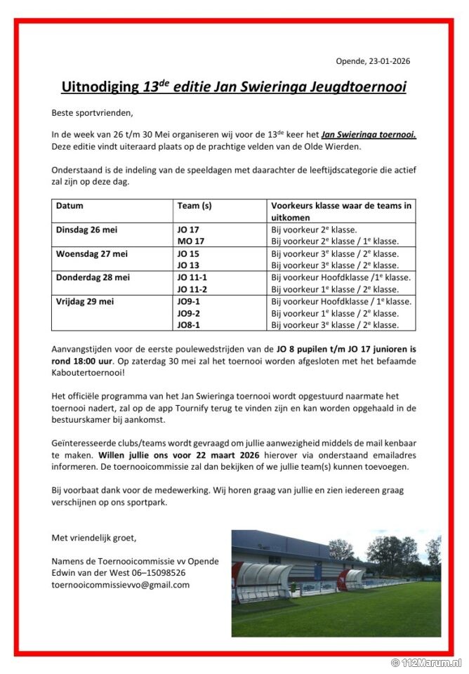 VV Opende maakt zich op voor de dertiende editie van het Jan Swieringa Jeugdtoernooi. In de week van 26 t/m 30 mei zal voor de 13de keer het toernooi worden georganiseerd op de prachtige velden van De Olde Wierden.