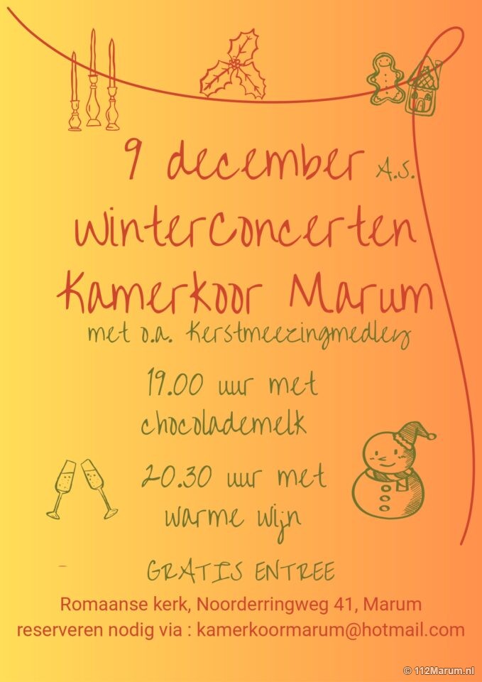 Winterconcert van Kamerkoor Marum Datum: dinsdag 9 december Op 9 december a.s. kunt u in de Romaanse kerk aan de Noorderringweg in Marum genieten van een winterconcert van het Kamerkoor Marum. Vanzelfsprekend zal de warme chocolade en warme wijn niet ontbreken. De entree is gratis. Dit item delen: Op Facebook Op X