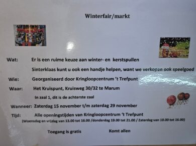 Winterfair markt in ’t Trefpunt Datum: zaterdag 29 november Op deze dag wordt alles met 50% korting verkocht! Dus mensen kom en sla Uw slag! Meer info vindt u op de flyer. Dit item delen: Op Facebook Op X