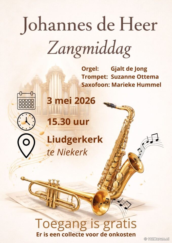 Zangmiddag in Liudgerkerk in Niekerk Datum: zondag 3 mei Op zondag 3 mei a.s. is er een Zangmiddag in de Liudgerkerk in Niekerk. De toegang is gratis, wel is er een collecte voor de onkosten. De middag begint om 15.30 uur en is vrij toegankelijk. Dit item delen: Op Facebook Op X