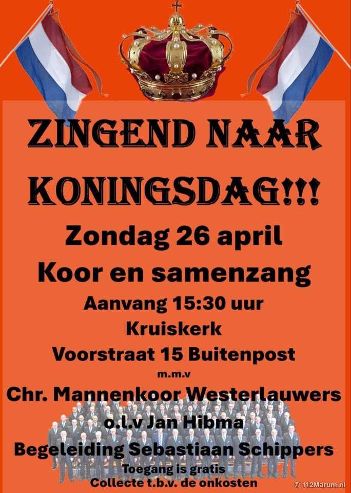 Naast koorzang is er samenzang. Zingend naar Koningsdag vindt plaats in de Kruiskerk in Buitenpost, aanvang 15.30 uur.