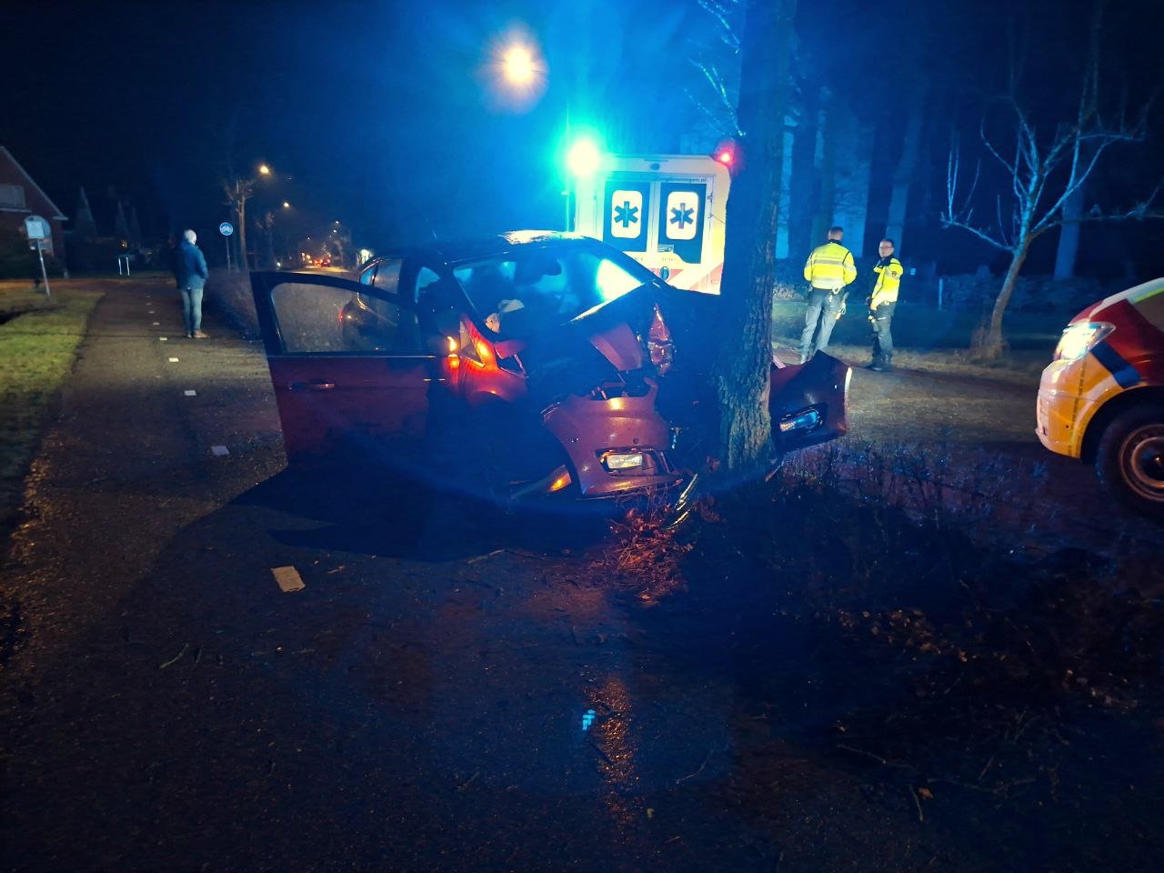 Ter plaatse bleek een auto tegen een boom te zijn gebotst. Ter plaatse gekomen ambulancepersoneel hebben de inzittende(n) van de auto onderzocht. Omdat het ongeval zich in eerste instantie ernstig liet aanzien, was ook het MMT ter plaatse. Of er ook iemand naar het ziekenhuis is overgebracht, is niet bekend. De politie doet onderzoek naar de oorzaak van het ongeval.