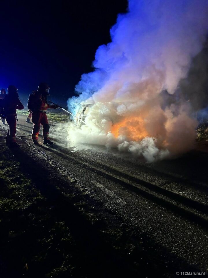 Kort daarna volgde een tweede melding: een autobrand op Eibersburen. Bij aankomst stond de auto al volledig in lichterlaaie. De brandweer bluste het vuur snel met een straal hogedruk. Hoe de brand is ontstaan, is niet bekend.
