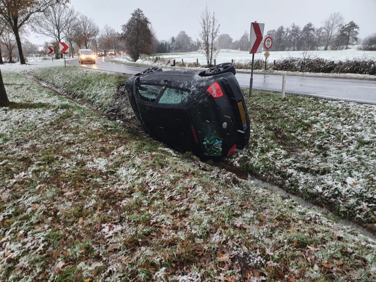 De vrouw raakte in de slip, en kwam zijdelings in een greppel tot stilstand. De auto die licht beschadigd raakte, is afgesleept door bergingsbedrijf Collewijn.