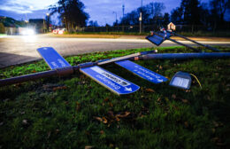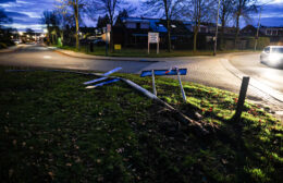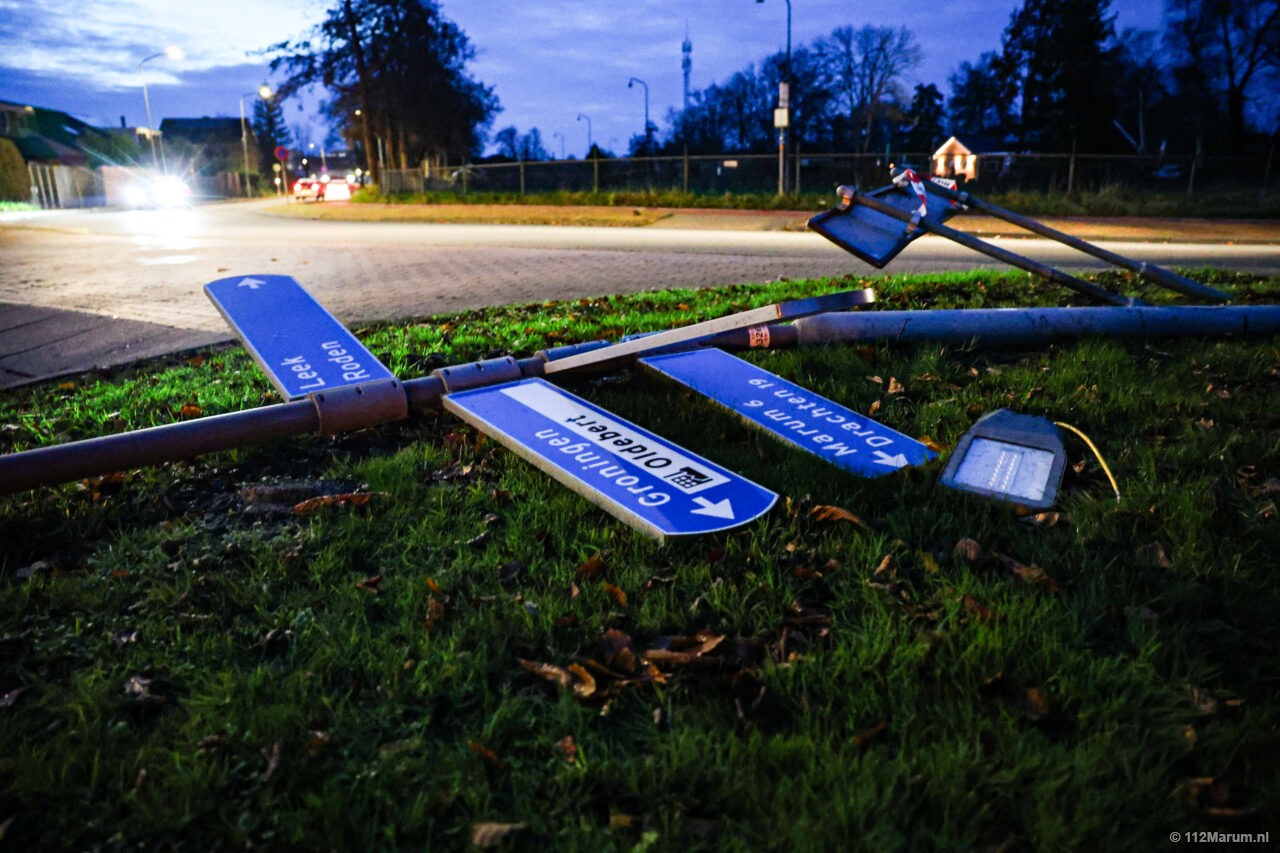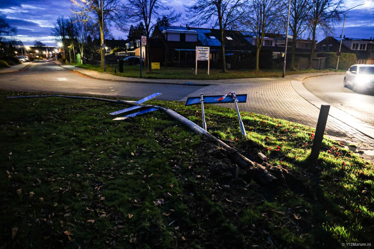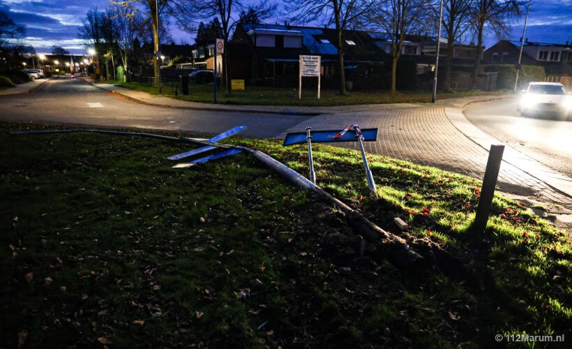Automobilist rijdt verkeersbord en lantaarnpaal omver