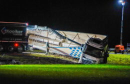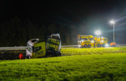 Een bergingsbedrijf is aanwezig om de lading te verwijderen. Pas nadat de aardappelen waren opgeruimd, kon worden begonnen met het wegtakelen van de vrachtwagen en de trailer.