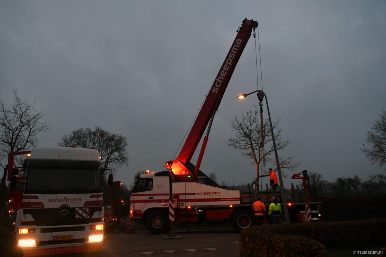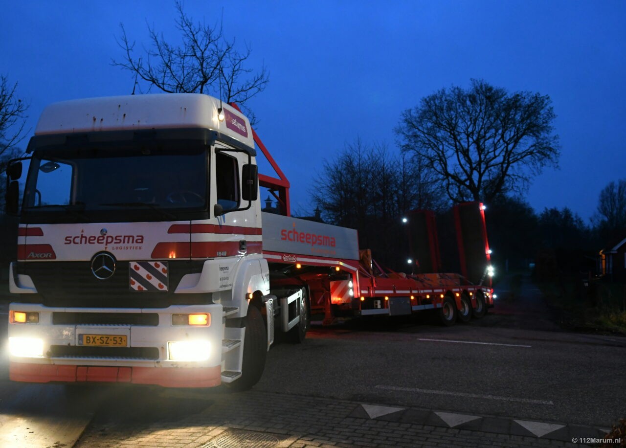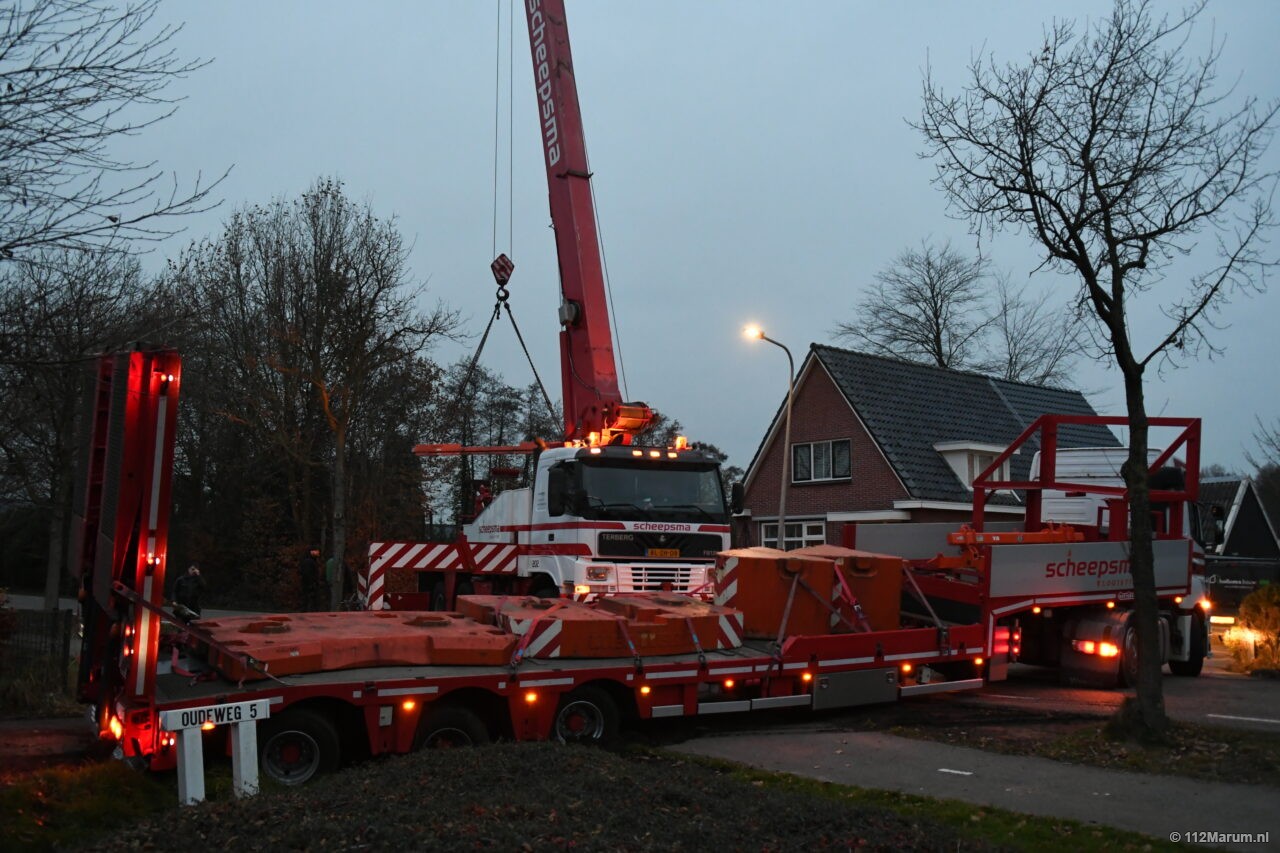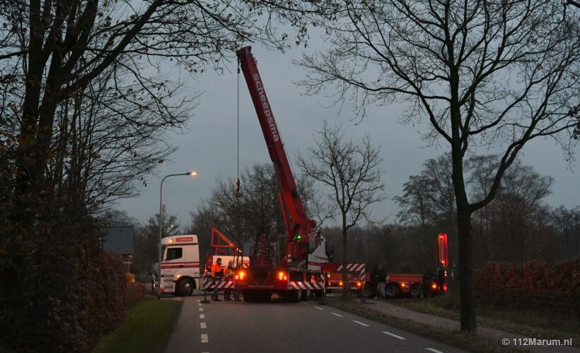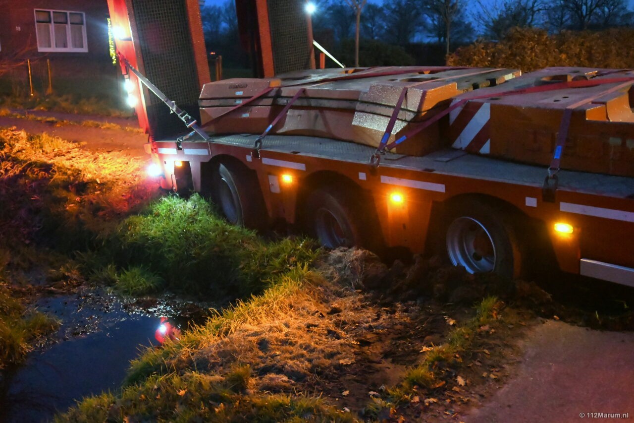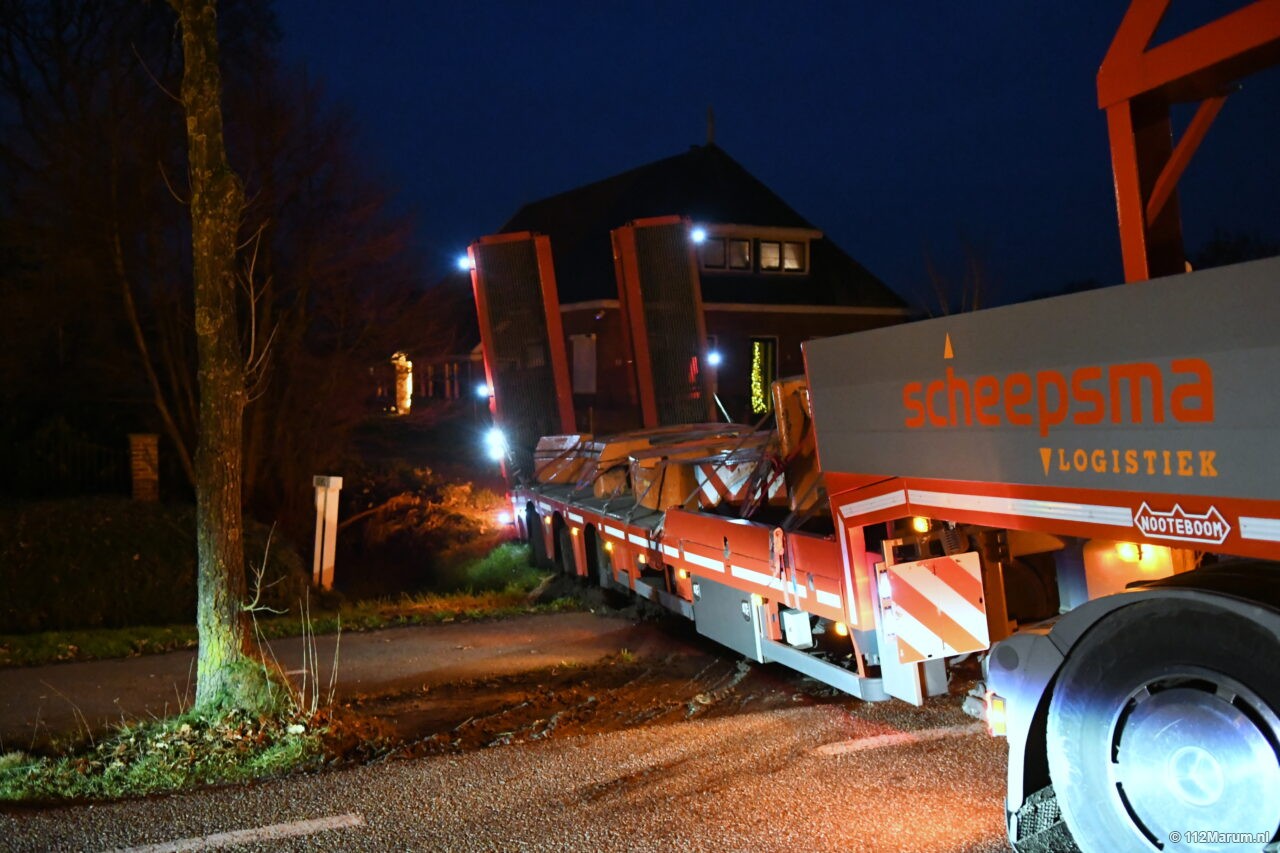 Een dieplader, geladen met zware gewichten, heeft vanmorgen enkele uren de Nieuweweg in Nuis geblokkeert.