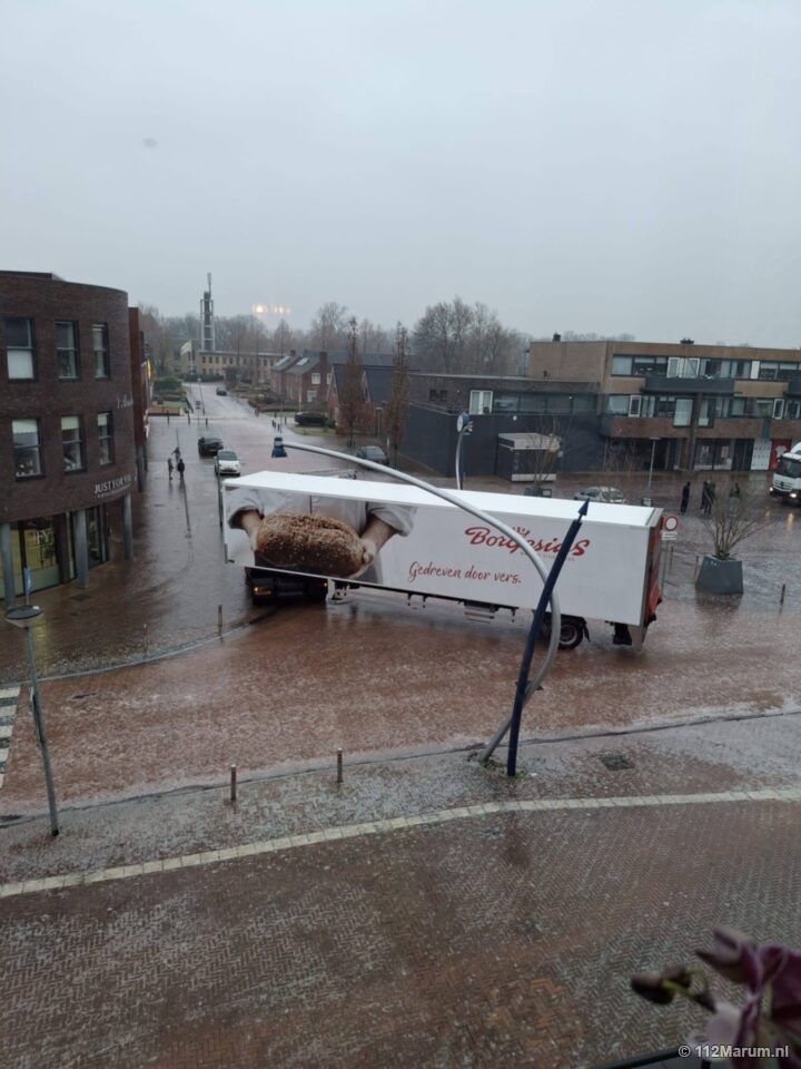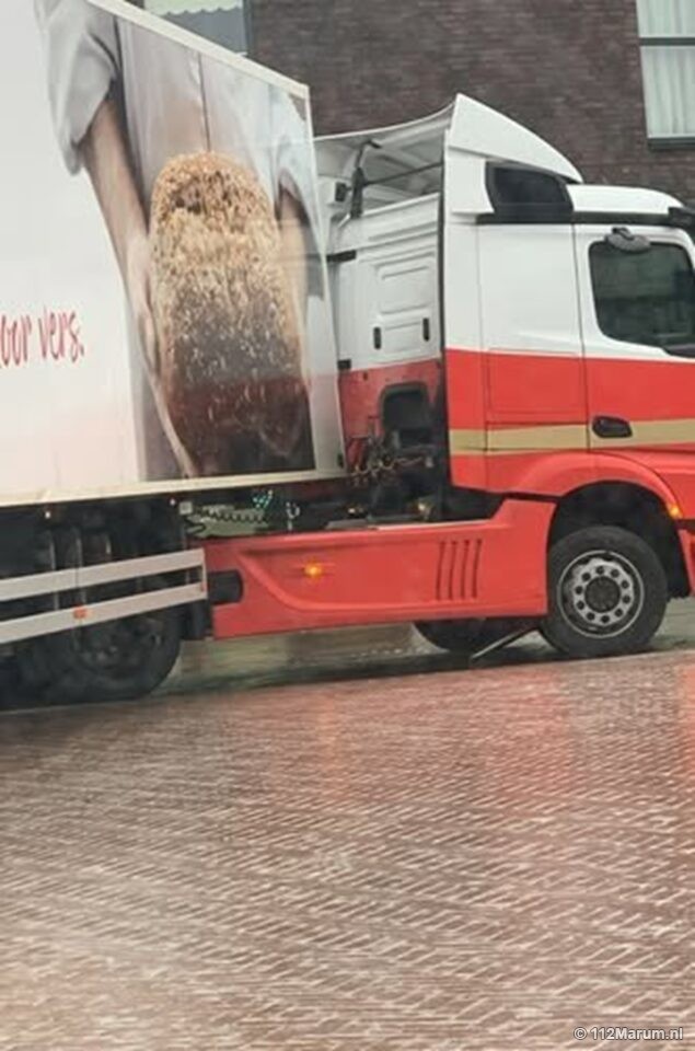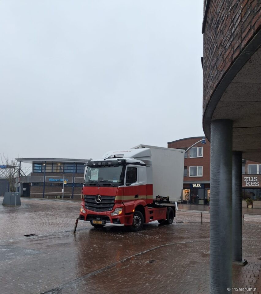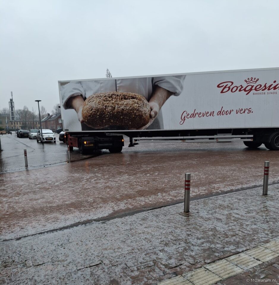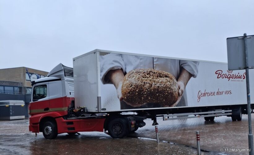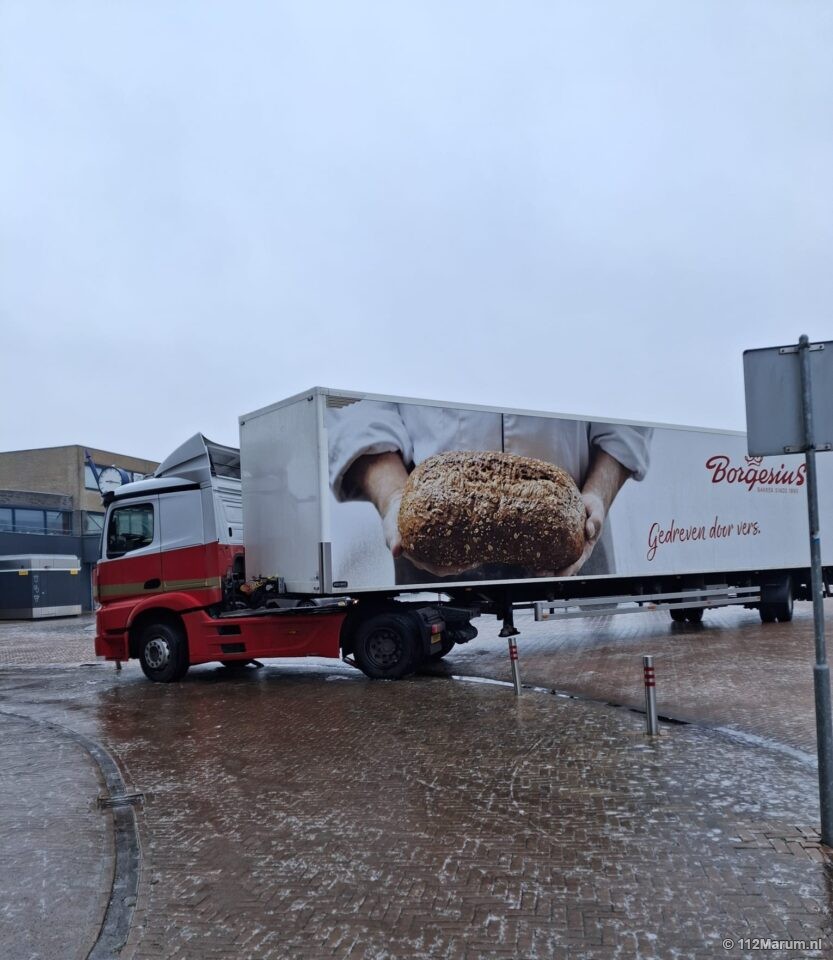 Een vrachtwagen geladen met brood is vanmorgen gestrand bij de AH vestiging in Marum.