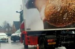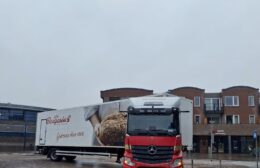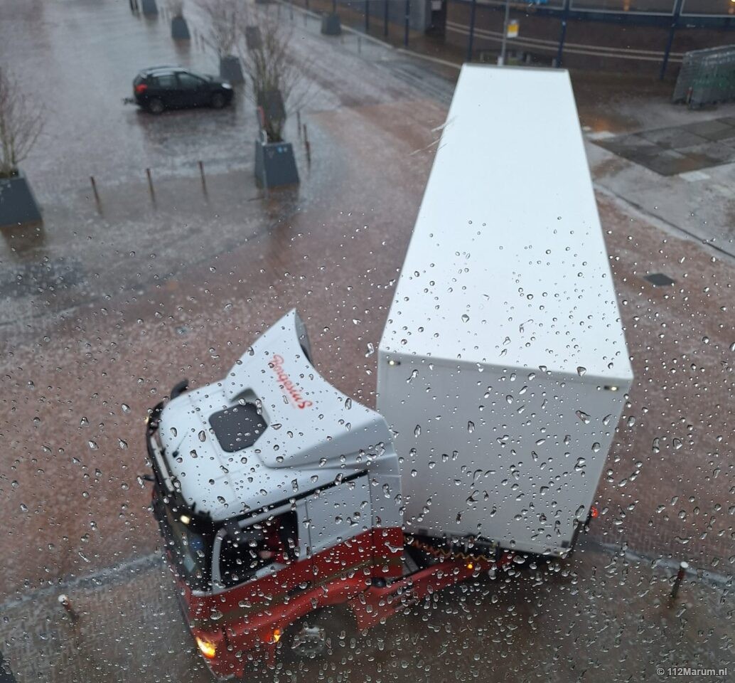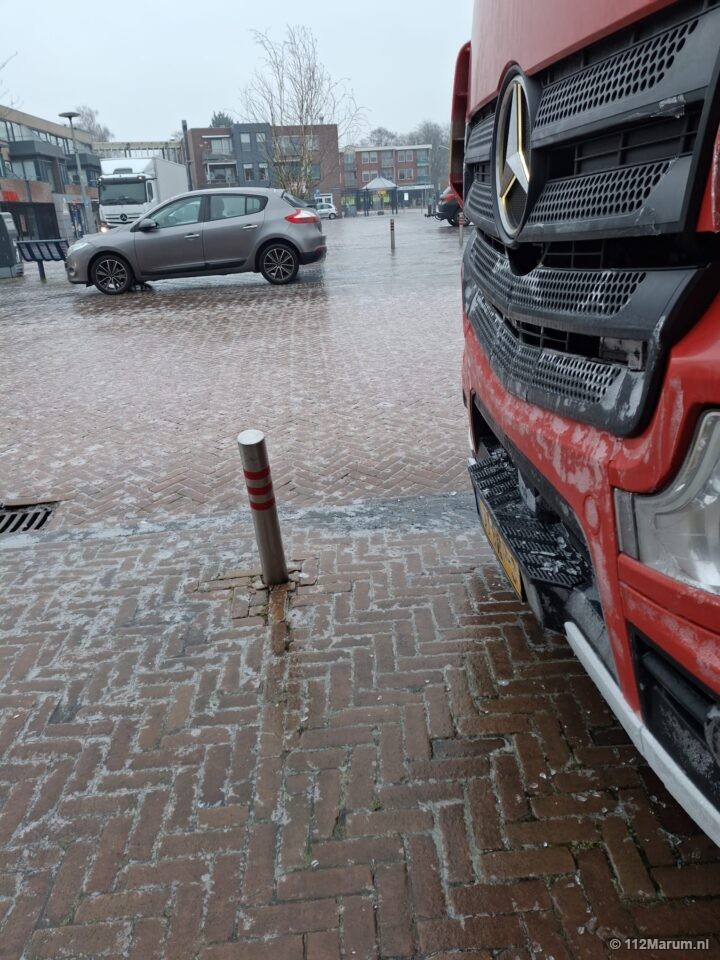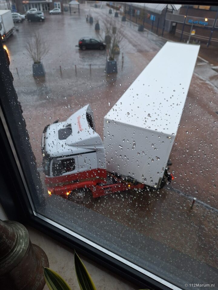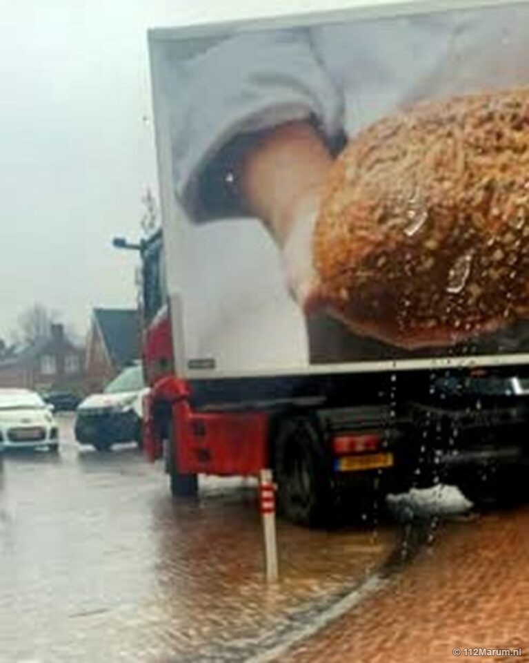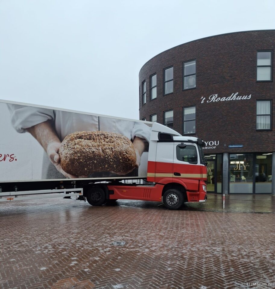 Een vrachtwagen geladen met brood is vanmorgen gestrand bij de AH vestiging in Marum.