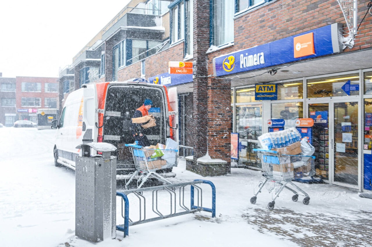 Ondanks de winterse omstandigheden gingen pakketdiensten en postbezorgers door met hun werkzaamheden in een poging zendingen af te leveren. Bij een supermarkt in het centrum werd zelfs geprobeerd een nieuwe levering naar binnen te krijgen.