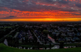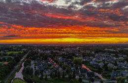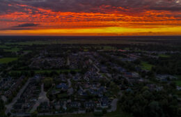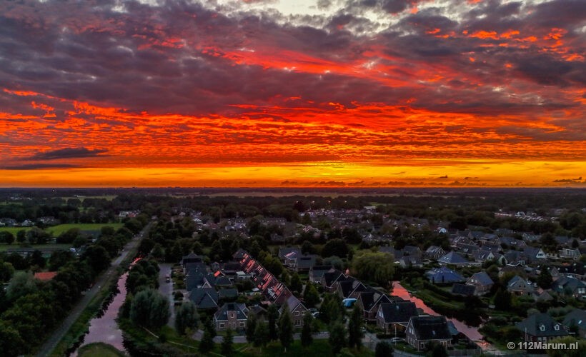 In De Wilp (Groningen) kleurde de lucht vanavond fel oranje en rood tijdens een indrukwekkende zonsondergang. Boven het dorp trokken wolkenvelden voorbij terwijl de ondergaande zon de hemel in vuur en vlam zette. Vanuit de lucht met een drone bood dit een bijzonder uitzicht over de woningen, sloten en het omliggende landschap.
