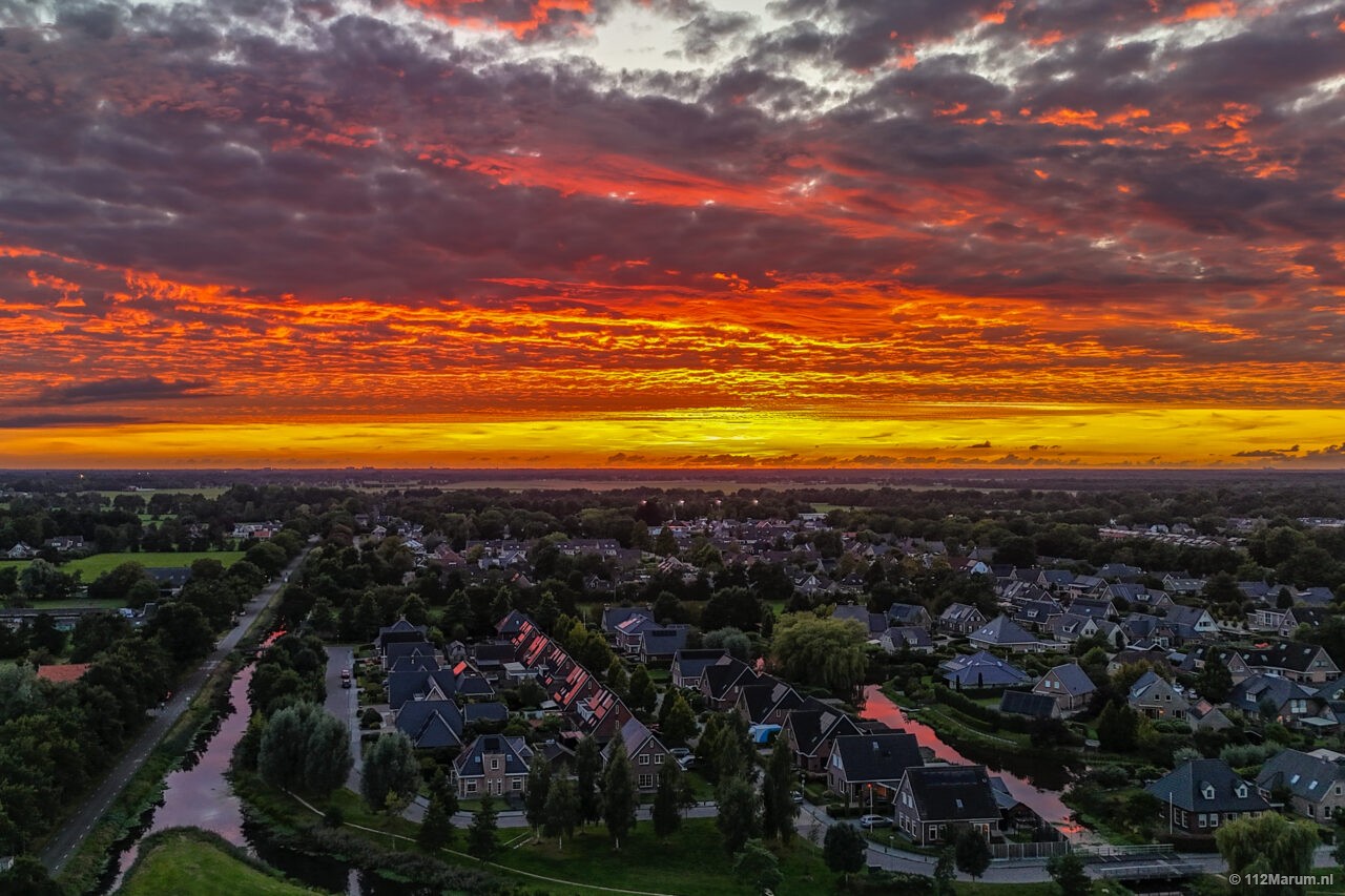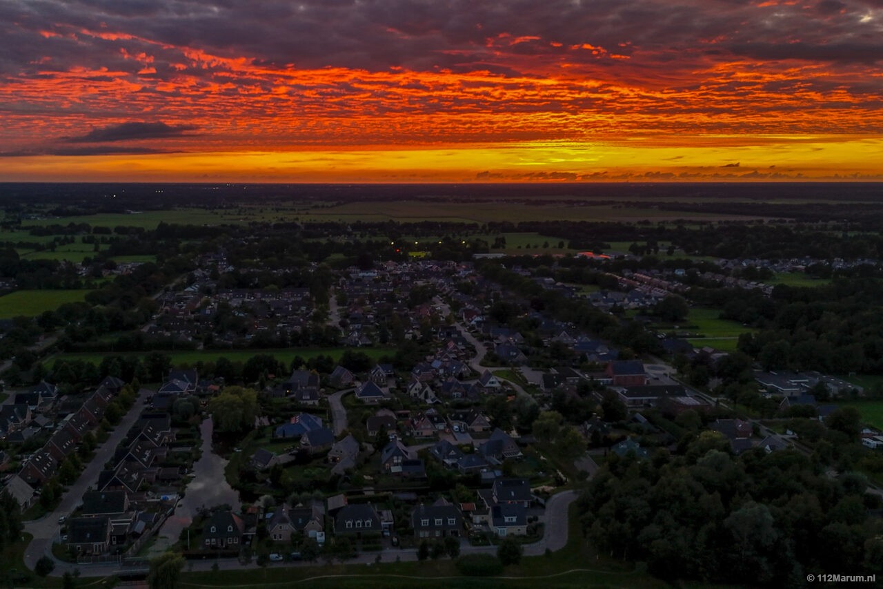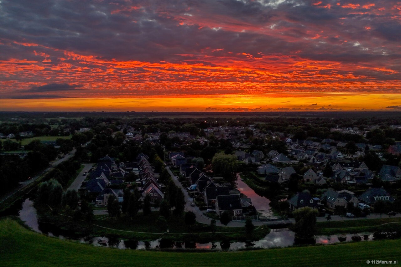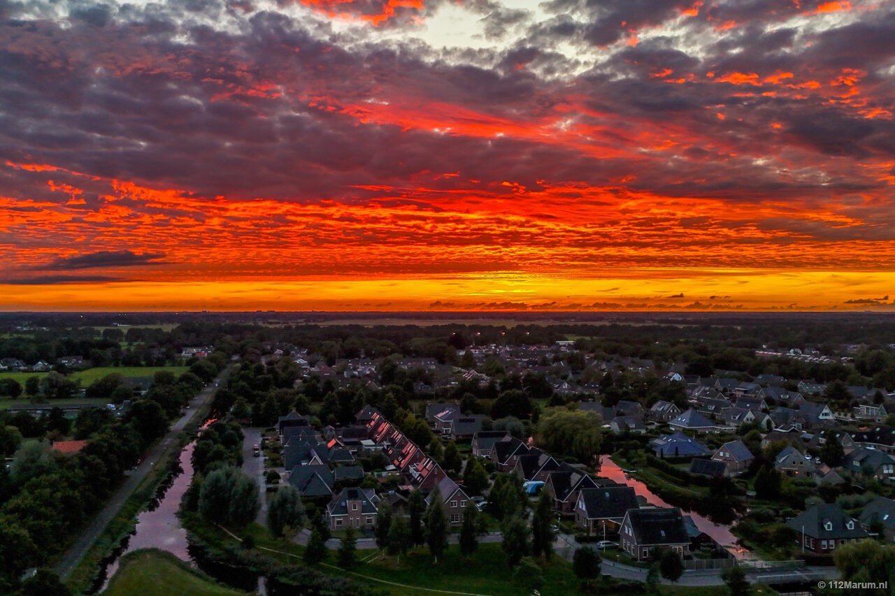 In De Wilp (Groningen) kleurde de lucht vanavond fel oranje en rood tijdens een indrukwekkende zonsondergang. Boven het dorp trokken wolkenvelden voorbij terwijl de ondergaande zon de hemel in vuur en vlam zette. Vanuit de lucht met een drone bood dit een bijzonder uitzicht over de woningen, sloten en het omliggende landschap.