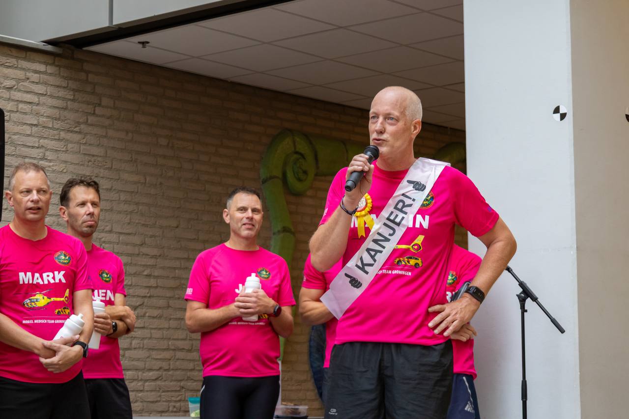 De laatste etappe voerde onder meer langs Groningen Airport Eelde en het Martini Ziekenhuis. Vanaf daar liepen de deelnemers gezamenlijk richting het UMCG, begeleid door motoragenten, fietsers en volgauto’s. Bij aankomst werden ze feestelijk onthaald en overhandigden zij een cheque met het eindbedrag.