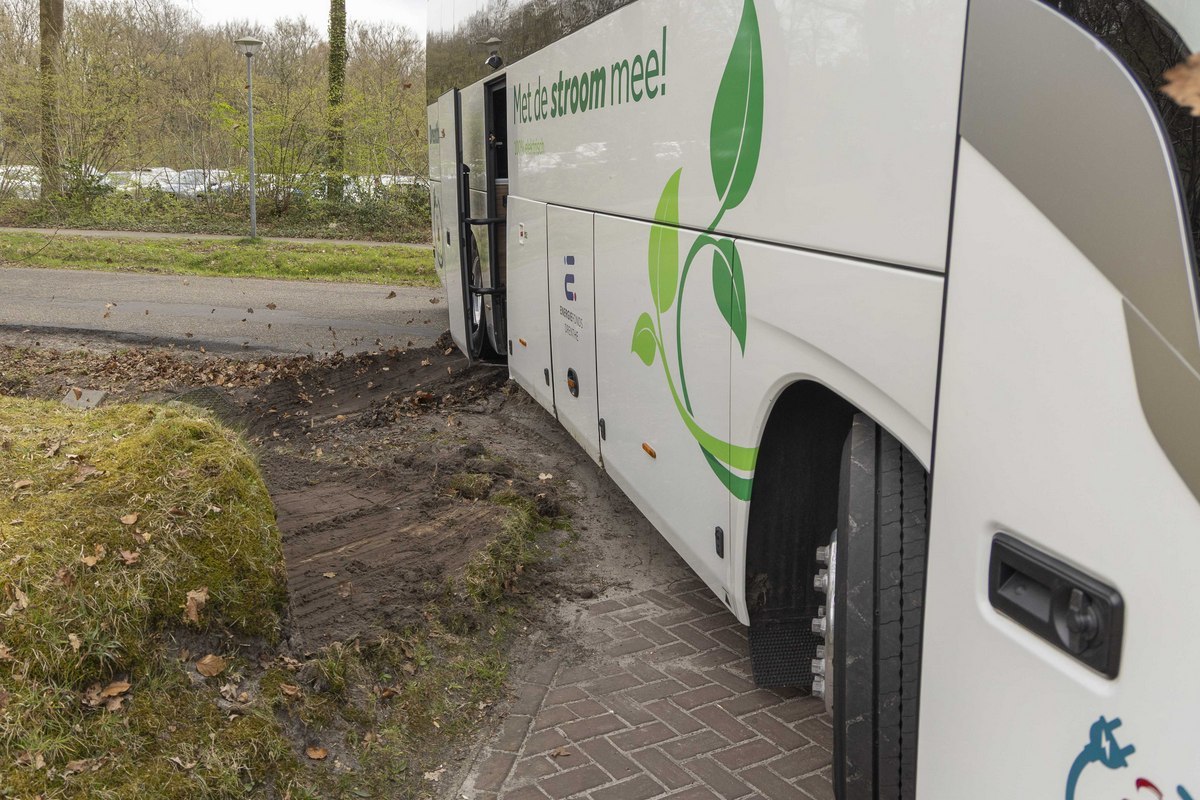 Vermoedelijk is de bocht verkeerd ingeschat naar een inrit, waardoor het voertuig van de weg raakte en vast kwam te zitten. Een berger moest eraan te pas komen om de touringcar weer veilig op de weg te krijgen.