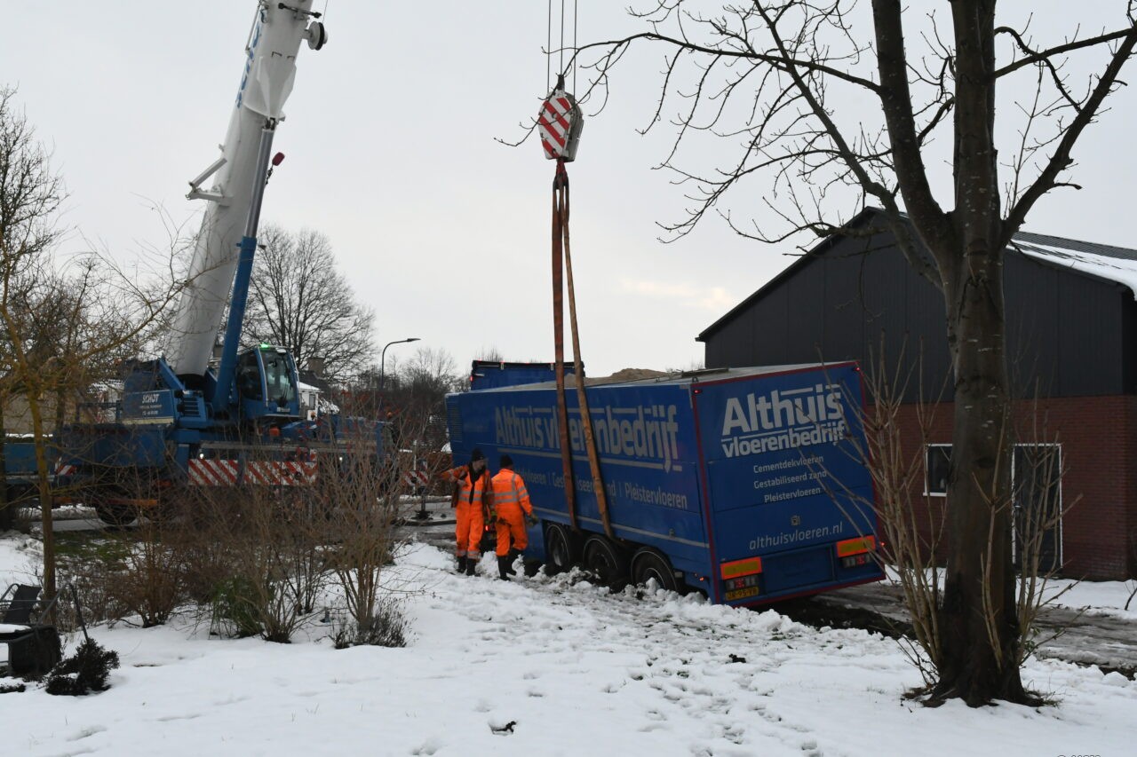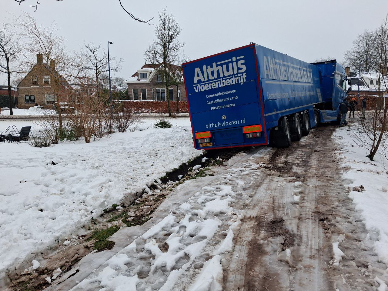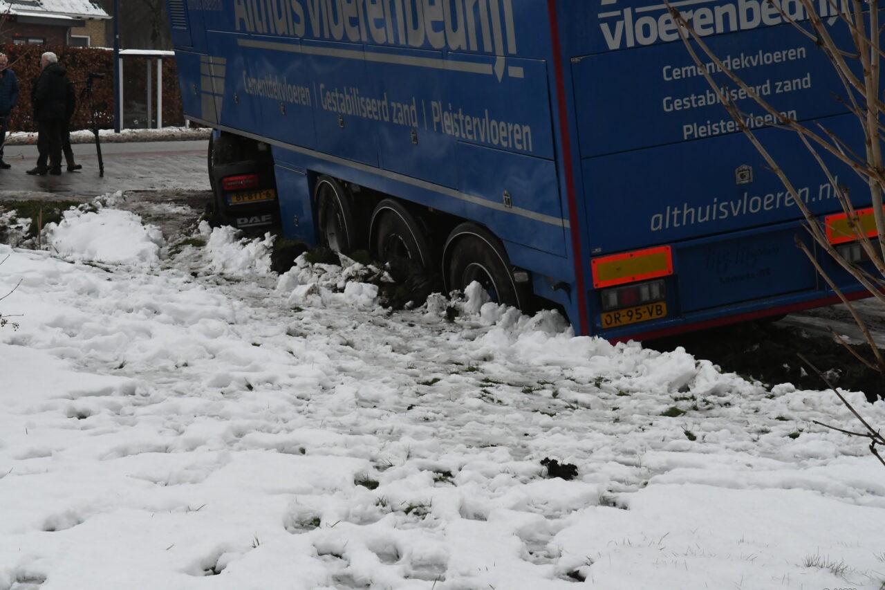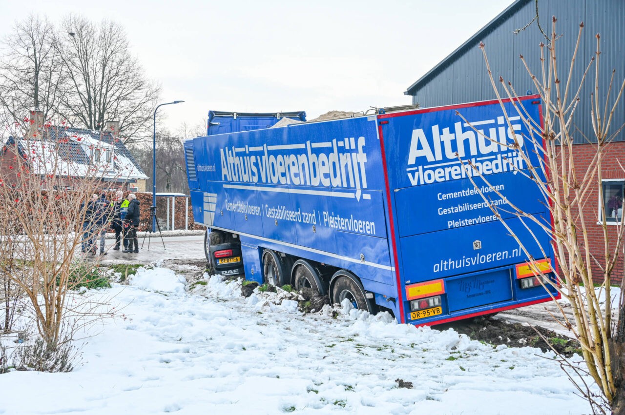 De vrachtwagen wilde achteruitrijden om zijn lading te lossen bij de boerderij, waar een nieuwe vloer gestort zou worden. Door de gladheid gleed de vrachtwagen de greppel in, en kwam vervolgens muurvast te zitten. Er is nog wel geprobeerd met tractoren de combinatie los te trekken, maar dit bleek onbegonnen werk.