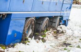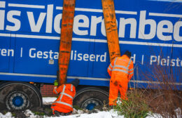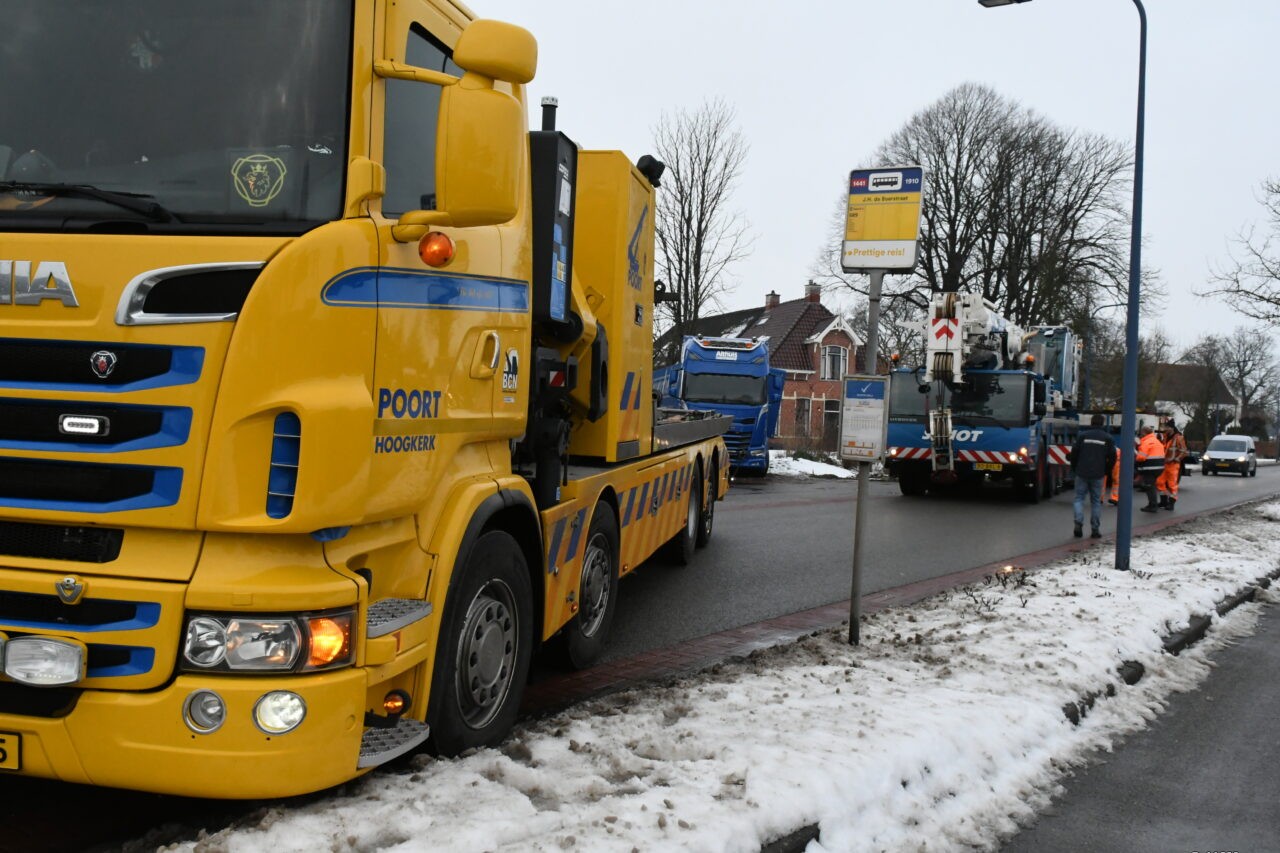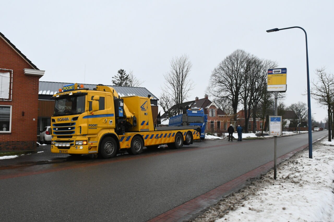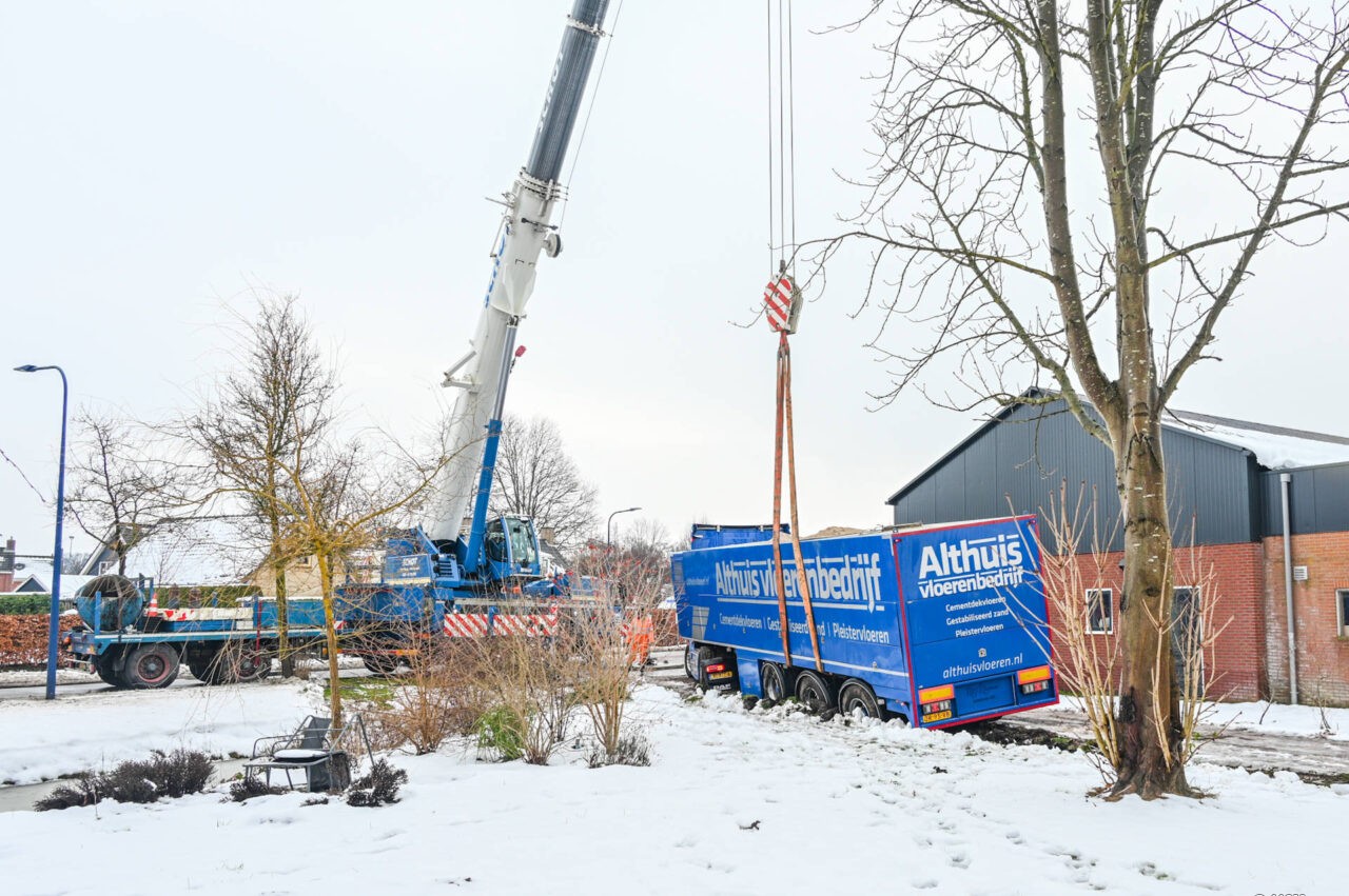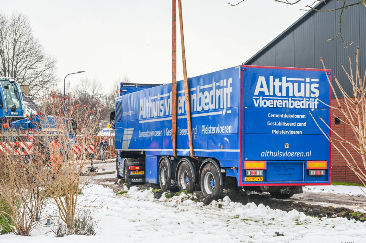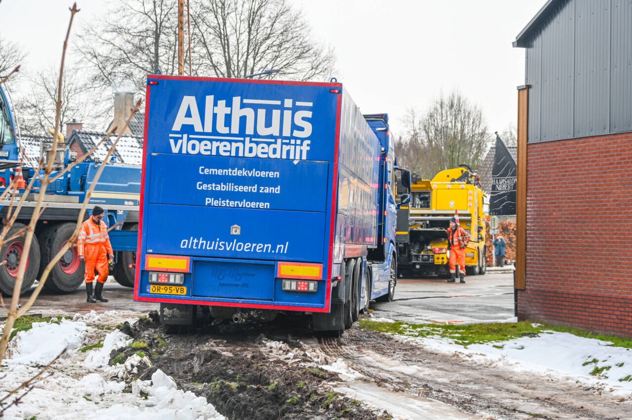 De vrachtwagen wilde achteruitrijden om zijn lading te lossen bij de boerderij, waar een nieuwe vloer gestort zou worden. Door de gladheid gleed de vrachtwagen de greppel in, en kwam vervolgens muurvast te zitten. Er is nog wel geprobeerd met tractoren de combinatie los te trekken, maar dit bleek onbegonnen werk.