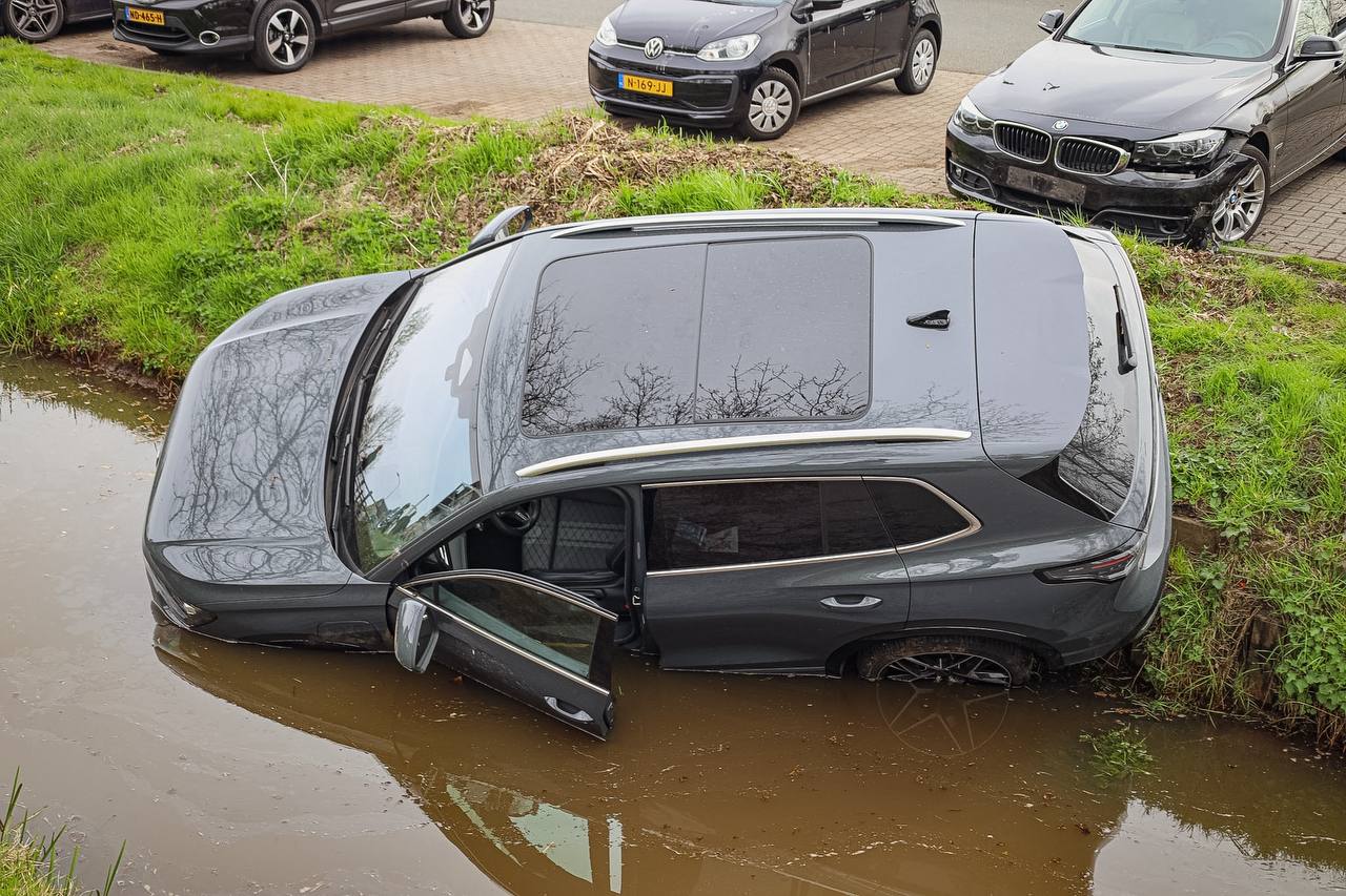 Aan de Schans in Leek is vanmorgen een auto te water geraakt.